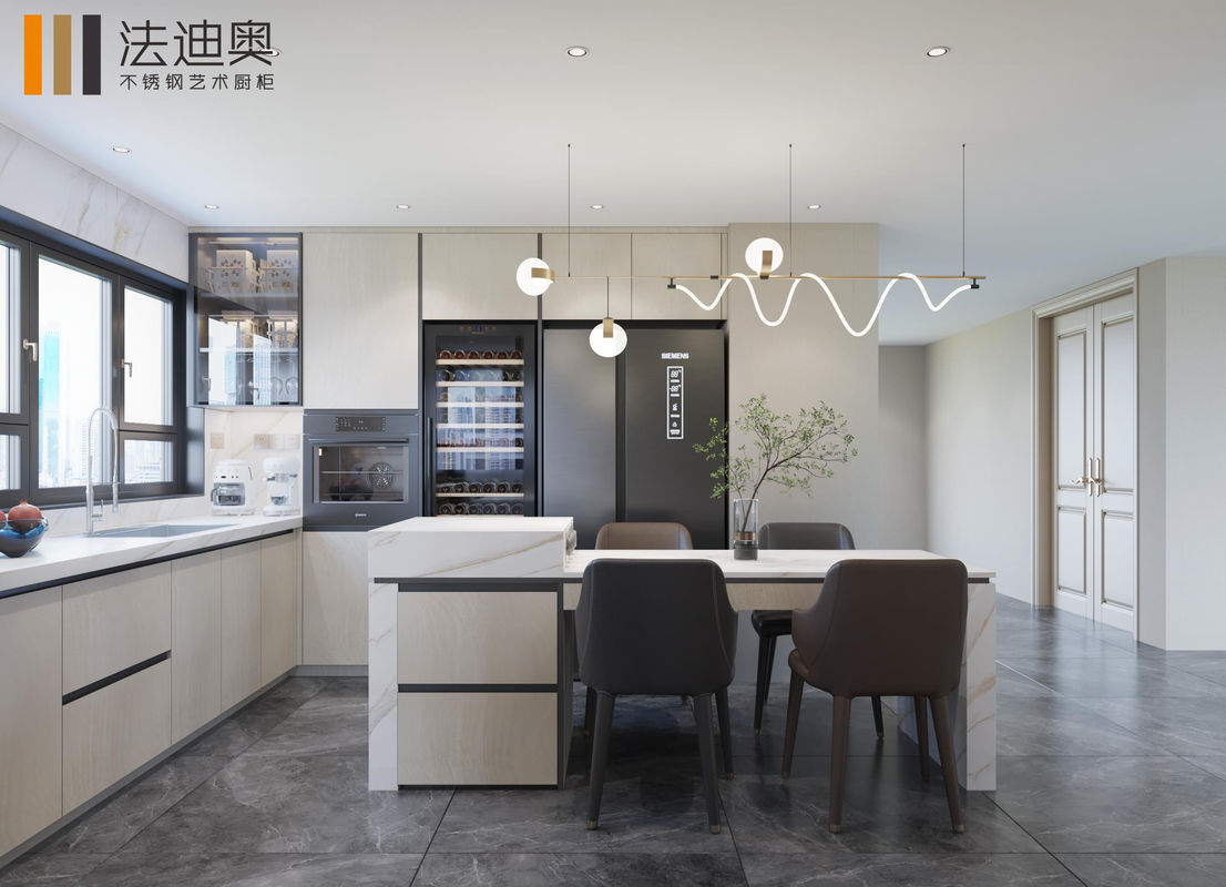 ตู้ครัวที่สั่งเองนี้ถูกสร้างขึ้นโดยใช้กลยุทธ์การเสร็จประเภทต่างกัน: ผงไม้คู่กับโครงสร้างตู้สแตนเลสการผสมผสานนี้ทําให้ผู้ซื้อมีอารมณ์หรูหราที่อบอุ่นมากขึ้น โดยไม่สูญเสียความสะอาดและความทนทานของโครงการที่คาดหวังจากตู้เหล็กไร้ขัด.
