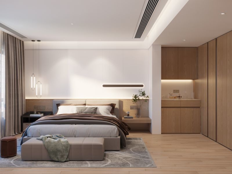 ตู้เสื้อผ้าเข้ามุมพร้อมมินิบาร์และโต๊ะเครื่องแป้ง |