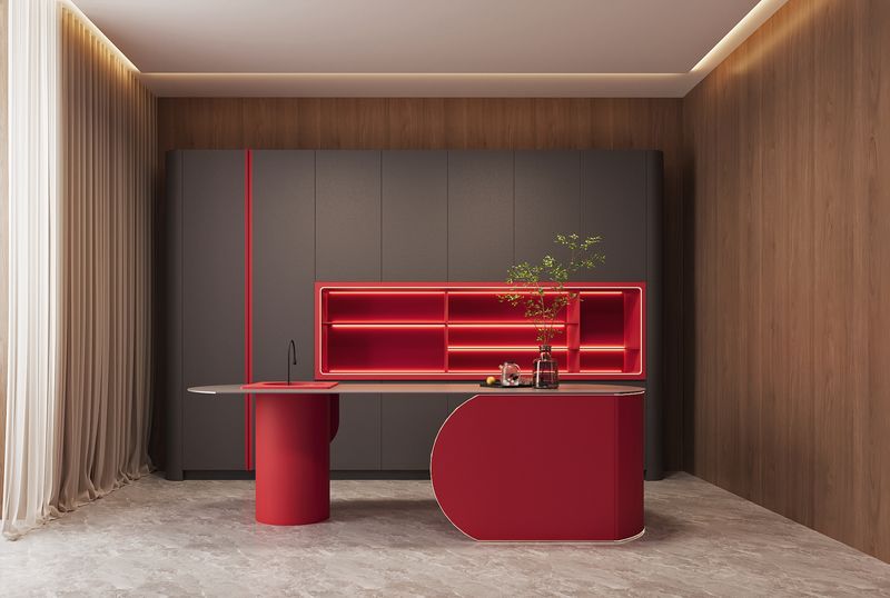 ตู้ครัวแบบสแตนเลสทรงเส้น สีดําและสีแดง