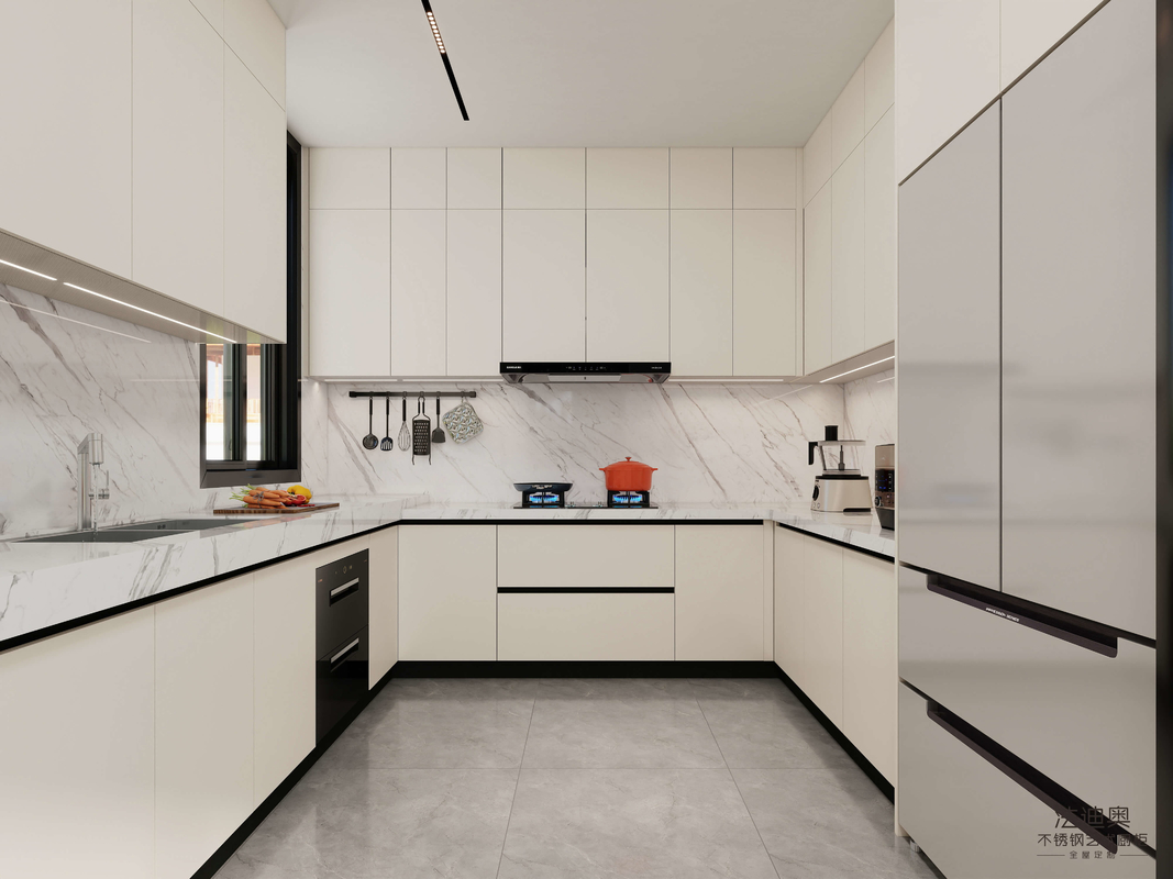 สัมผัสการผสมผสานที่ลงตัวของการออกแบบที่เรียบง่ายและความเป็นเลิศในการใช้งานด้วยโซลูชันครัวแบบหลายโซนที่เป็นนวัตกรรมใหม่ของ Fadior การจัดวางที่ซับซ้อนนี้แยกพื้นที่ครัวเปียกและแห้งอย่างเชี่ยวชาญ ในขณะเดียวกันก็รวมบาร์อาหารเช้าอเนกประสงค์ สร้างพื้นที่ที่แตกต่างแต่เชื่อมต่อกันสำหรับการทำอาหาร ตู้ที่สะอาดตาในสีขาวนวลเข้ากันได้อย่างลงตัวกับพื้นผิวควอตซ์สีขาวที่กว้างขวางซึ่งทอดยาวไปทั่วเคาน์เตอร์และแผ่นกันกระเด็น สร้างการไหลเวียนของภาพอย่างต่อเนื่อง ชั้นวางติดผนังที่วางอย่างมีกลยุทธ์พร้อมไฟ LED ในตัวช่วยเพิ่มทั้งฟังก์ชันการทำงานและบรรยากาศ ในขณะที่การแบ่งโซนอัจฉริยะช่วยให้สามารถเตรียมอาหาร ทำอาหาร และมีปฏิสัมพันธ์ทางสังคมได้พร้อมกัน ความเชี่ยวชาญของ Fadior ในการปรับแต่งบ้านทั้งหลังเปล่งประกายผ่านการกำหนดค่าที่รอบคอบนี้ ซึ่งวัสดุระดับพรีเมียมมาบรรจบกับการออกแบบตามหลักสรีรศาสตร์เพื่อสร้างครัวที่ใช้งานได้จริงและสวยงาม