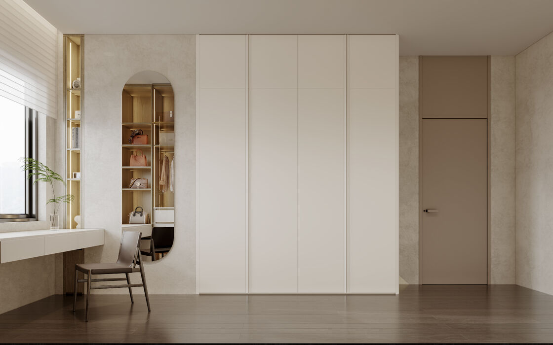 การออกแบบตู้เสื้อผ้าสไตล์มินิมอลร่วมสมัยที่ผสมผสานเส้นสายทางสถาปัตยกรรมที่สะอาดตาเข้ากับพื้นผิววัสดุที่อบอุ่นและโทนสีกลางที่นุ่มนวล |