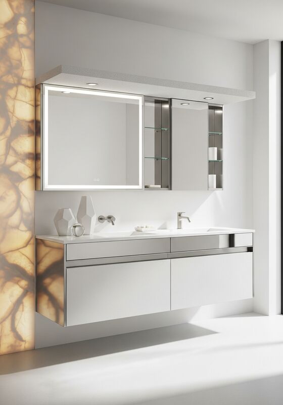 | Material & Performance304 food-grade stainless steel with mirror-polished select panels and pearl white nano-coated main surfaces; seamless solid-surface countertop with integrated basin supports moisture resistance, finish stability, and long-term daily use in master bathroom en-suite, luxury residential powder rooms, high-end hospitality suites, architect-designed wellness spaces. That matters when buyers need architectural appearance without wood-based maintenance risk. |