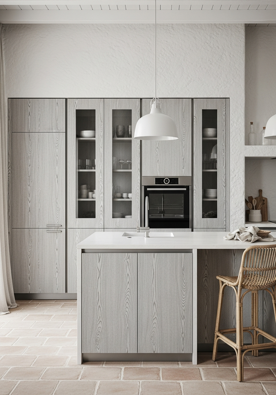 | Color | Whitewashed silver-grey (primary cabinet face), warm white (frame and plaster references), pale terracotta (compatible floor tone), natural flax (textile pairing) |
