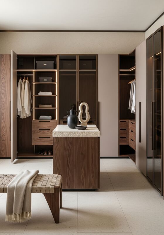 | จุดเด่นของการออกแบบความเรียบง่ายอบอุ่นสไตล์โรงแรม; ห้องแต่งตัวในโรงแรมบูติก; วัสดุสัมผัสได้พร้อมพื้นผิวไร้ความเงา; การบูรณาการทางสถาปัตยกรรมเหนือวัตถุเฟอร์นิเจอร์ ด้วยสีน้ำตาลโอ๊คเข้มที่มีโทนสีแดงเจือจาง, สีเบจแคชเมียร์โทนอบอุ่น, โทนสีปูนฉาบสีเทาอบอุ่น, การตกแต่งด้วยโลหะบรอนซ์รมควัน, สัดส่วนที่ได้ระเบียบวินัย, และโครงสร้างสแตนเลสพร้อมลามิเนตโอ๊คผิวแมทท์แบบเปิดรูพรุน ลายขวาง หน้าเว็บควรอ่านเหมือนข้อกำหนดที่สมบูรณ์ ไม่ใช่กล่องเก็บของทั่วไป |